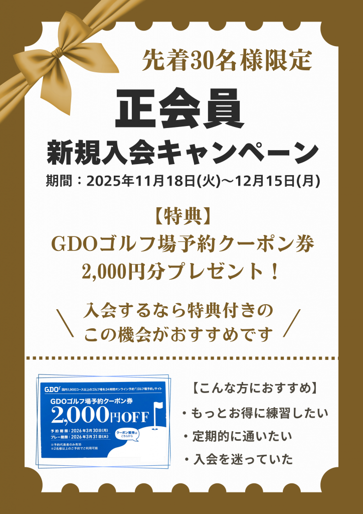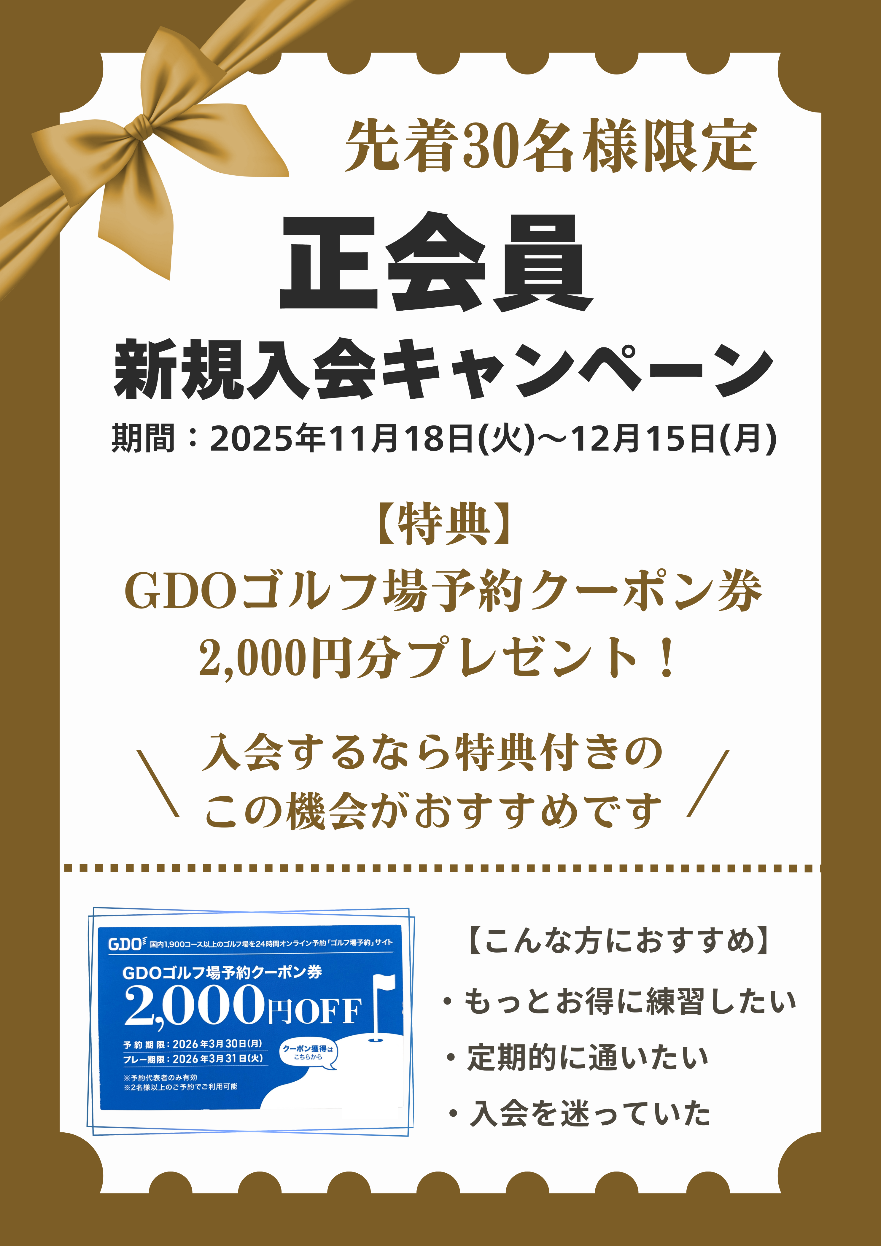 正会員新規入会キャンペーン 2025.11.18 こんな方におすすめです! ◆もっとお得に練習したい ◆定期的に通いたい ◆入会を迷っていた 対象(※先着30名様) 新規で正会員にご入会いただいたお客様 (年会費:5,500円) キャンペーン期間 2025年11月18日(火) ~ 12月15日(月) ※定員に達し次第、早期終了いたします。 特典 GDOゴルフ場予約クーポン券 2,000円OFFプレゼント!