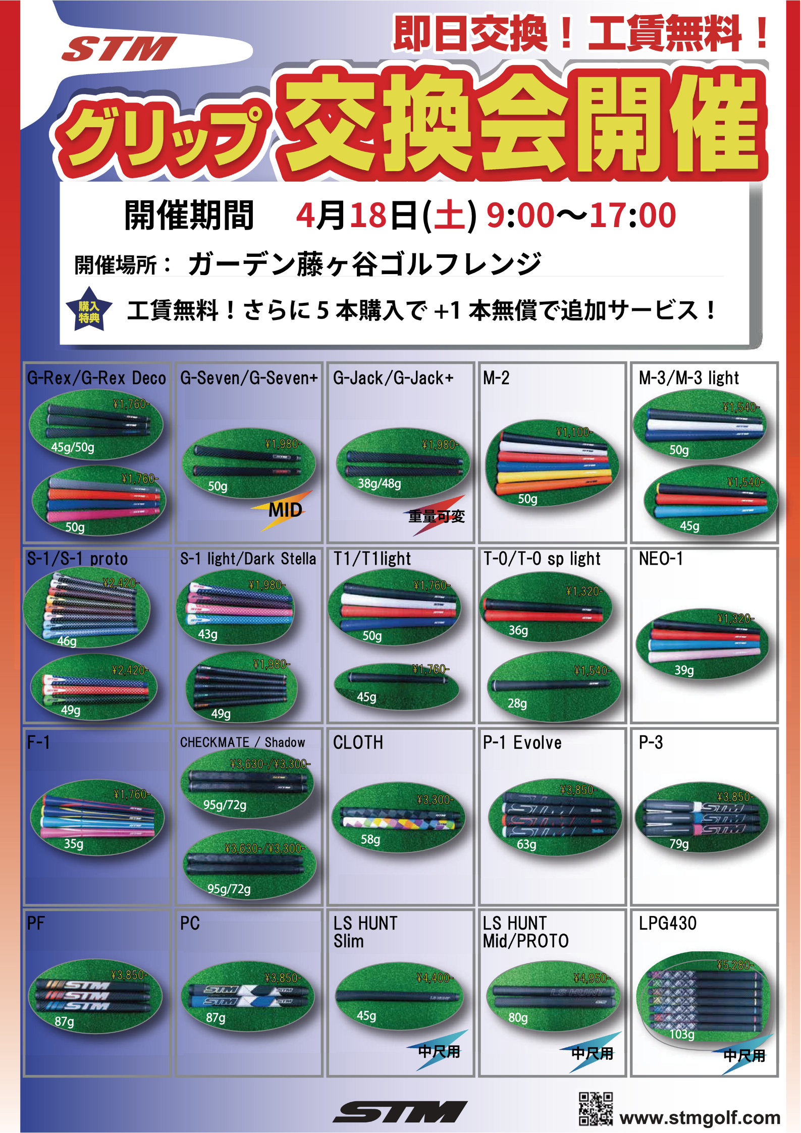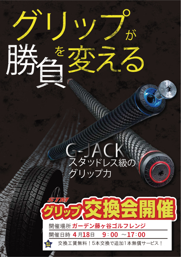 4/18(土) STMグリップ交換会 2026.03.28 当店初開催🎉 STMグリップ交換会 ■日時 4/18(土) 9:00~17:00 G・S・T・Mシリーズ、NEO-1、F-1 Lady’s、パター用まで豊富にご用意。 しっかり握れるグリップ力と、滑りにくい安定感でスイングをサポート。 さらに豊富なカラーで、自分好みのカスタマイズも楽しめます。 「グリップでここまで変わる!」をぜひ体感してください。 皆様のご来店をお待ちしております。
